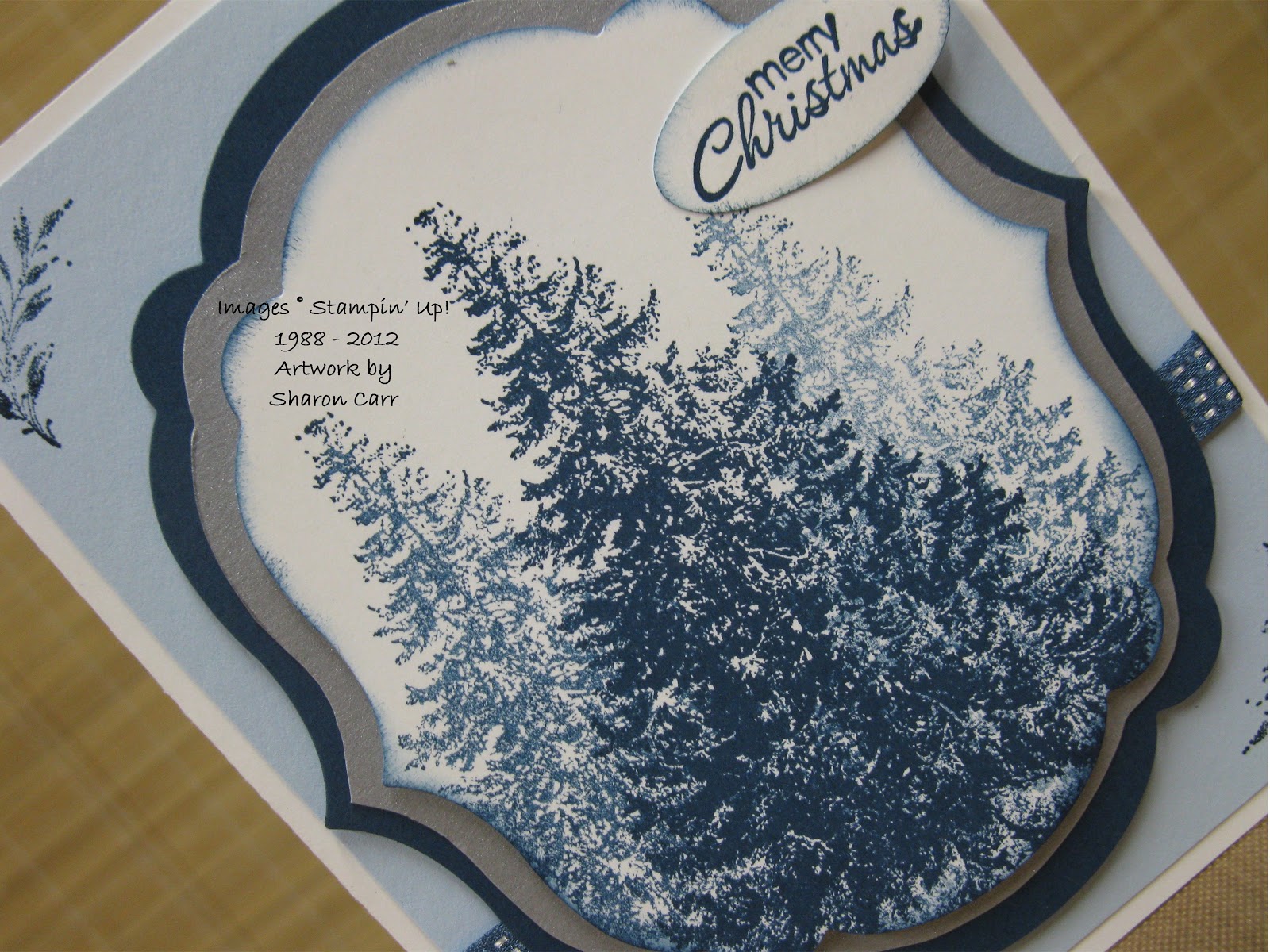 I just love this tree done with multiple stamping to give it a "foresty" look. What, there's no word like that? Oh well, you all know exactly what I mean, don't you? So that's 5 stampings from just one inking. That ink is really intense! And each one of the stamped trees are all great different blues. Love it!